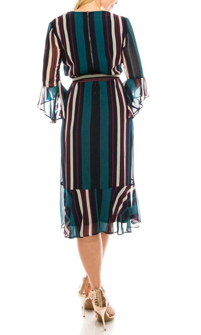 | Details: | Stripe Motif, Chiffon, Sash Tie, Circular Flounce Sleeves, Wrap Skirt, Surplice Bodice, Full Back, Back Zipper Closure, Ruffled Trim, Tea Length Hem |