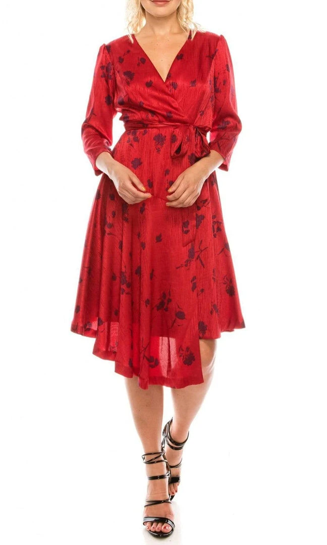 Look perfect in this timeless dress by Maison Tara 91143M. This midi dress features a plunge surplice V neckline with self-fabric waist tie ribbon, puffed quarter length sleeves and asymmetrical hemmed wrap A-line skirt. The fully enclosed back features an exposed zipper. Get that casual look with sophistication and class with this style from Maison Tara.
