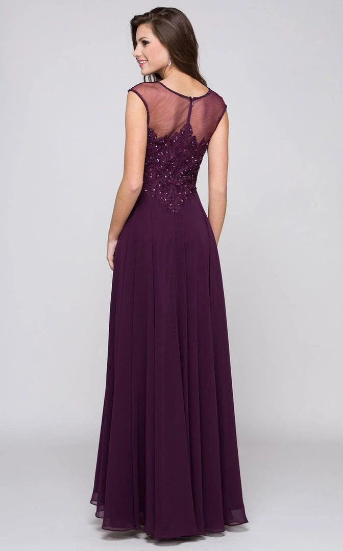 Glide into a party in stunning elegance and effortless grace in this fascinating Marsoni M107 creation. Spectacularly embroidered with intricate scroll design peppered with rhinestones, this lovely piece showcases a bateau illusion over a sweetheart neckline with sheer cap sleeves and a full back. Bordered with an elaborate lace embroidery at the natural waist, the A-line skirt streams beautifully down as it softly pleats down to a full-length hem. Move and sway with flawless refinement all night long in this Marsoni by Colors masterpiece.