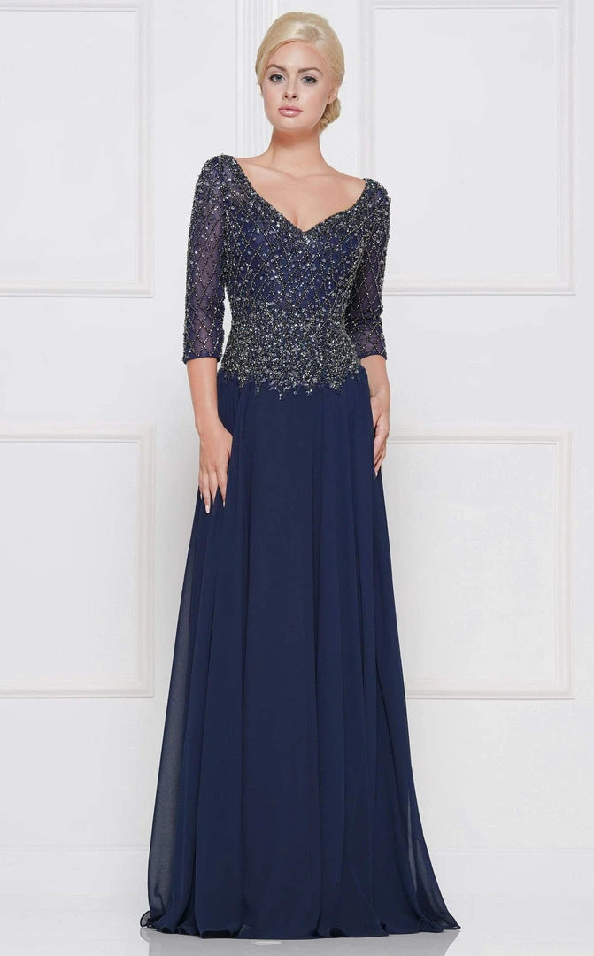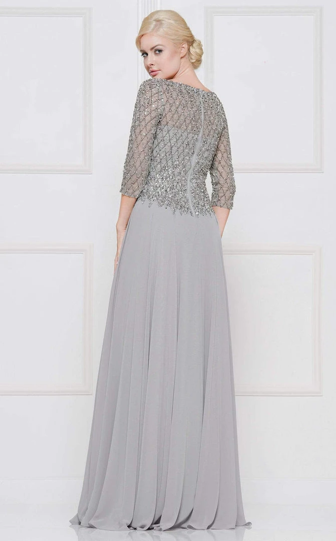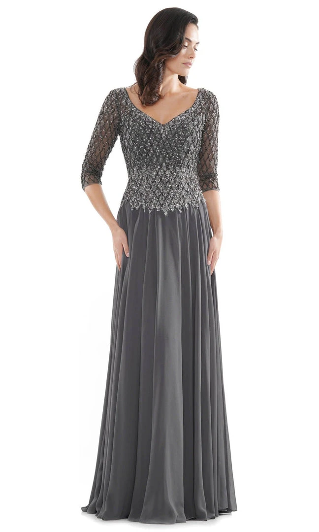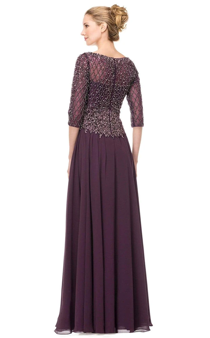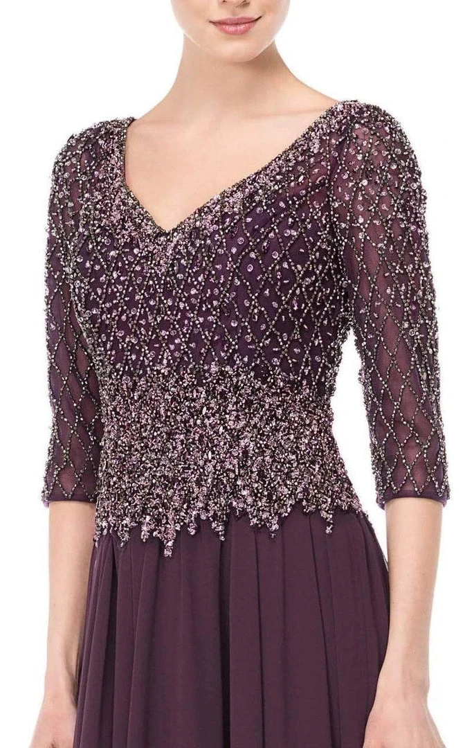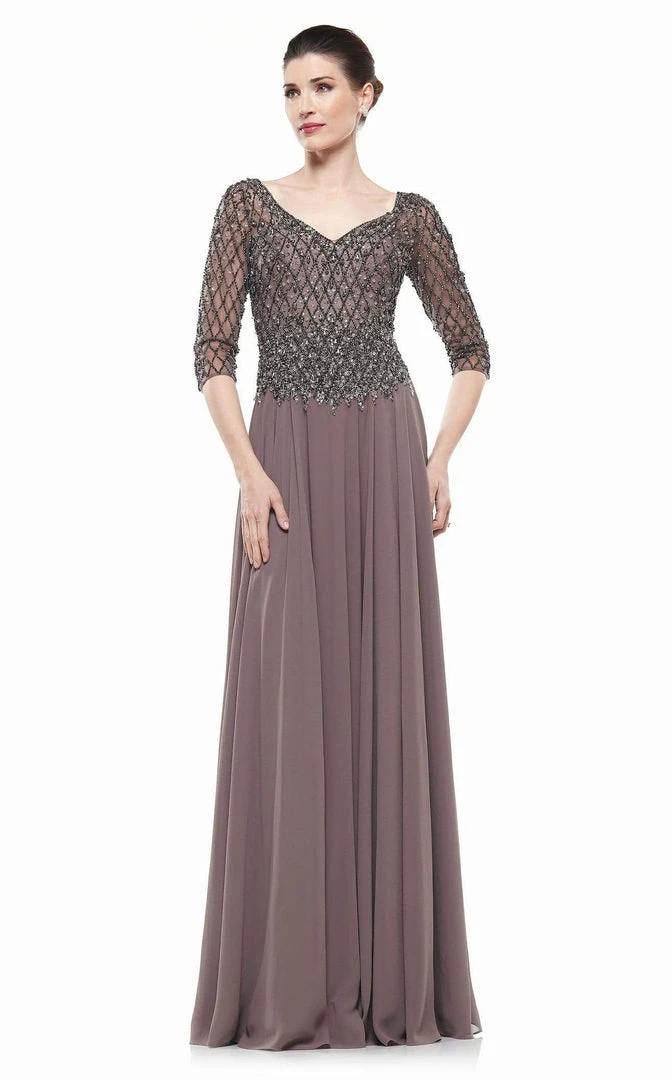 Enthrall your adoring public with your feminine poise and elegant style in this lavish Marsoni M165 creation. Embellished with a heavy touch of shimmering beads on a lattice designed sheer bodice, this spectacular piece flaunts a delicate V-shaped illusion over a sweetheart neckline framed with sheer quarter sleeves and a mesh full back. Dripping at the waistline with a sumptuous dose of glittering beadwork, the layered chiffon A-line skirt softly pleats as it cascades elegantly down to a full-length hem. Have star struck stares follow your every move in this Marsoni by Colors masterpiece. Model is wearing the Dark Plum color.