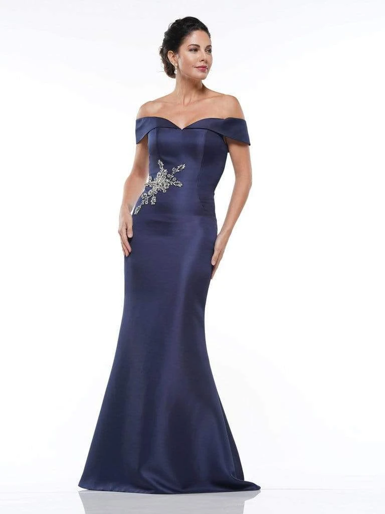 Catch a glint of sparkle in his eyes as you walk by in this Marsoni By Colors MV1003 creation. Sculpted in a sleek fabric, this lavish piece shows an off shoulder neckline with a foldover sweetheart notch design. Sewn at the side with a florid beadwork, the sleek skirt has a slight mermaid flare and a shiny finish. Look elegant as you saunter in grace in this Marsoni by Colors masterpiece. Models are wearing the Blush and Navy colors.