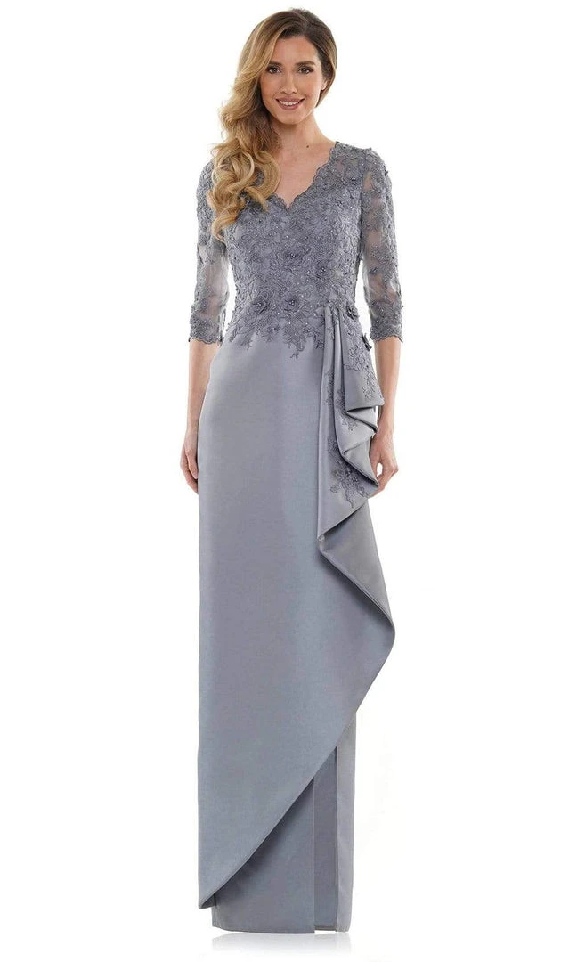 Heighten your elegance appeal as you wear this Marsoni by Colors MV1134 evening dress. This dress highlights a V neckline supported by half sleeves in a fitted and lace appliqued bodice. The skirt reveals a sheath silhouette while the back shows a full back with back zipper closure. Dare to bare in this classy Marsoni by Colors design.