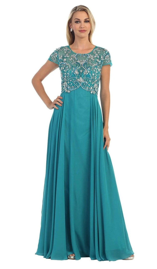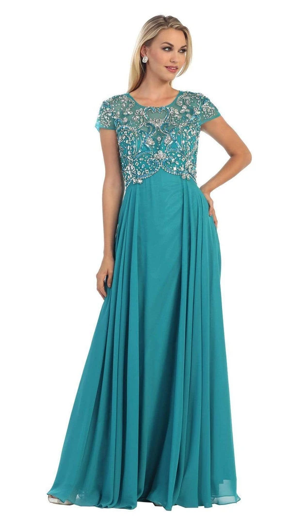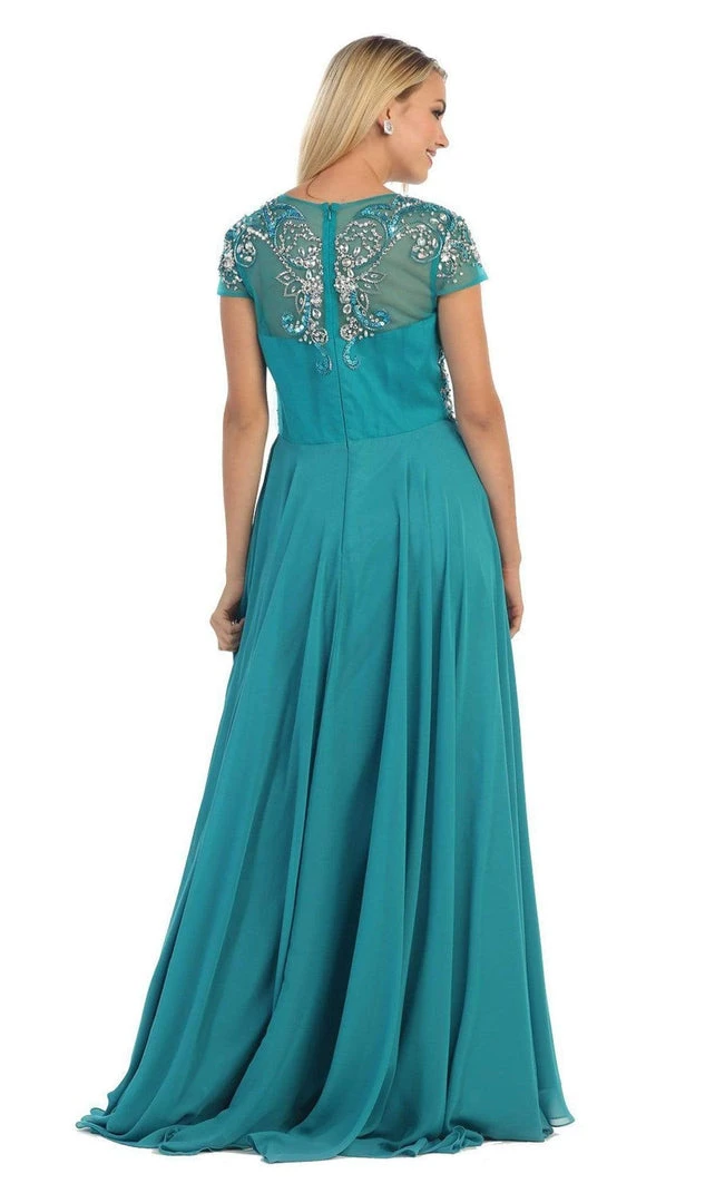 Strike a pose as you enter the room in this exquisite May Queen MQ1100 creation. Beautifully festooned with twinkling crystal adornments, this captivating piece flashes an illusion scoop over a sweetheart neckline paired with dainty cap sleeves. Richly decorated in jewels while forming an inverted basque treatment around the waist, this stunner flows into a cascading A-line silhouette. Be ready to mesmerize all night long in this glamorous May Queen masterpiece. Models are wearing the Teal Green and Silver colors.