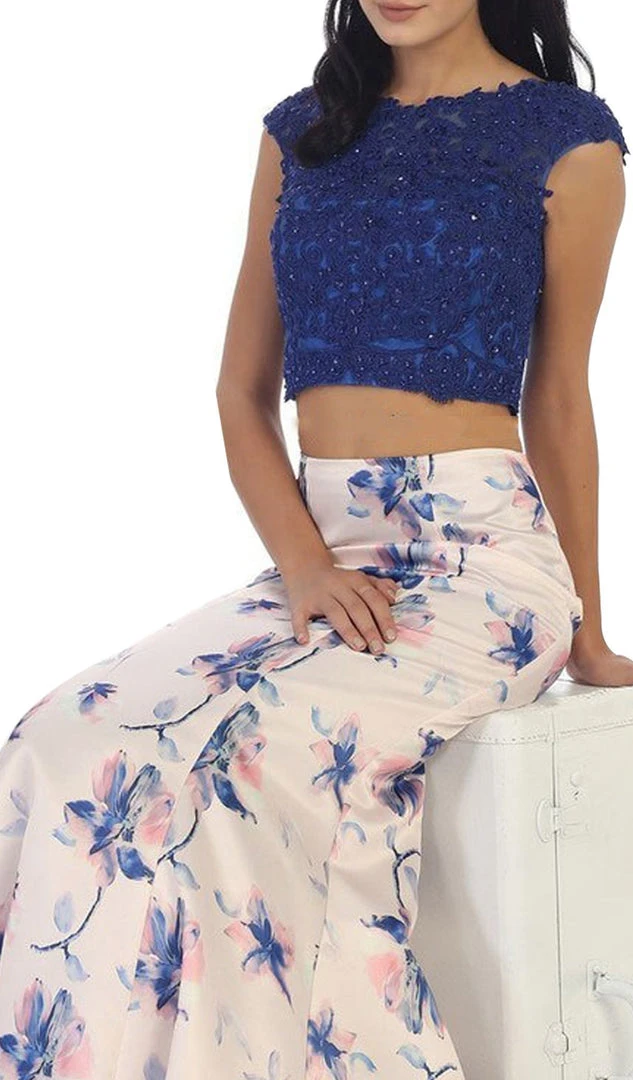 | Details: | Two-piece, Cap sleeve, Beaded lace applique, Floral print skirt, Back keyhole |