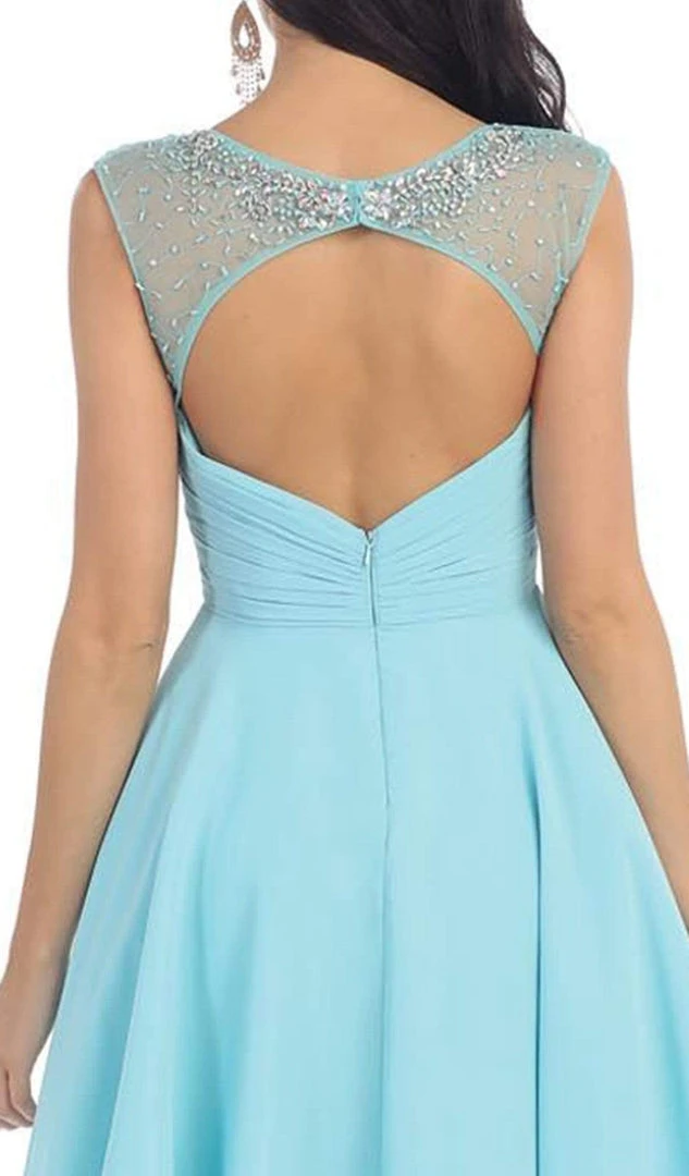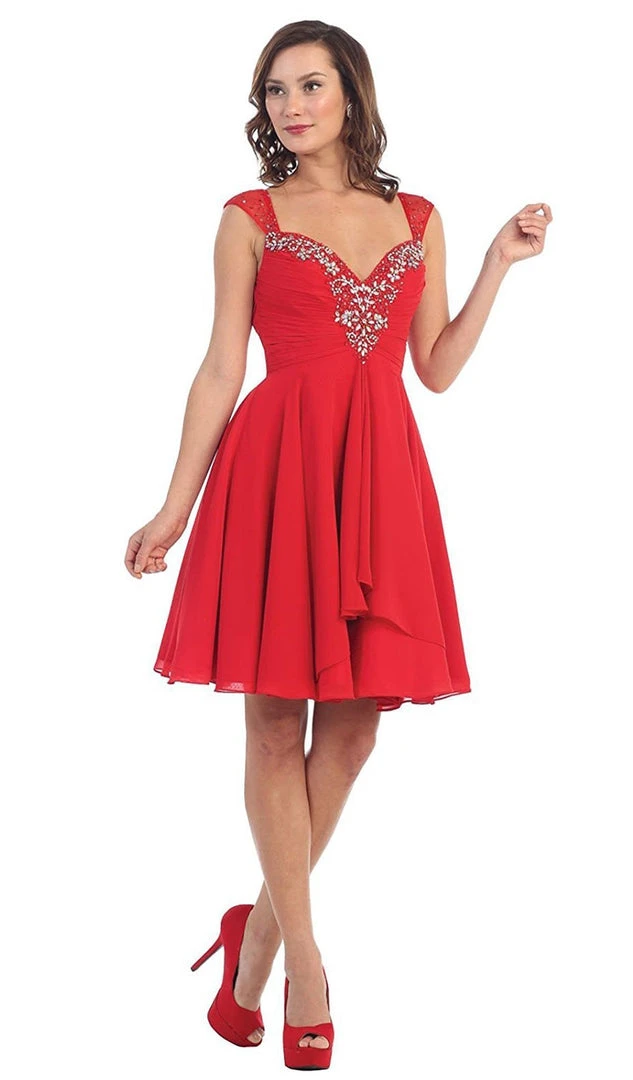 Glamour of for a romantic night that was meant to be unforgettable in this May Queen MQ-1188 creation. Elaborately ornate with crystals arranged in a floral motif on a ruched bodice, this stunner shows a sweetheart neckline framed with ornate illusion cap sleeves. Delicately tailored with a sheer jeweled back dominated with a fan cutout, the beautifully arched basque waist streams down layers of chiffon that flutter down to a short hemline. Make the decision to shine all night long in this vividly ornate May Queen masterpiece. Models are wearing the Aqua, Coral and Red colors.