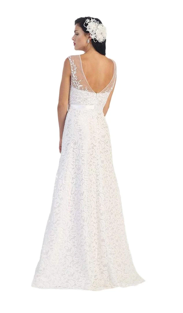 Sophisticated and statuesque, this sumptuous style for evening matches your elegant persona. Models in cap sleeves, illusion bateau neckline with bodice embroidered and cinched in a ribbon band. The back reveals a V-cut while the Laced skirt flows into an A-line silhouette. This dress brings together all the essentials for a great look at prom or party!