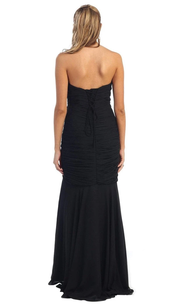 Make a statement with this gracious dress. This long strapless chiffon dress has a sweetheart neckline with multiple miniature pleats adorning a princess waistline. A hand beaded and sequin starburst design decorates the front of the dress. The chiffon skirt of the dress has a high split that accentuates the leg with each step, making it the perfect dress to wear to a homecoming or prom dance. The back of the dress is plain and there is a hidden zipper entry on the side of the dress. This is flawlessly tailored to fit your curves.