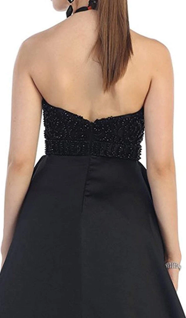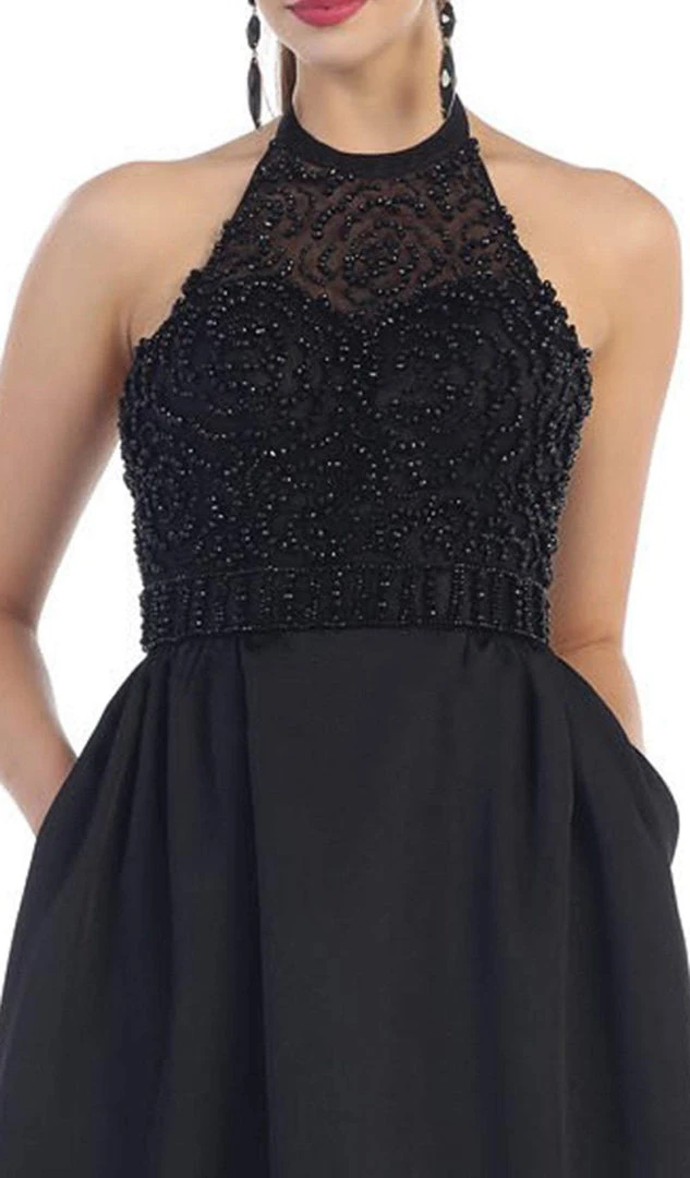 You are more than gorgeous when you wear this unbeatable evening gown by May Queen RQ7411. A halter neckline forms a sleeveless appeal. An illusion bib and excellent beading details the fitted bodice. Polished fabric creates a full-length A-line skirt with detailed shirring and a wide flare for a ballgown silhouette effect to the floor. This design by May Queen will absolutely make you feel special!