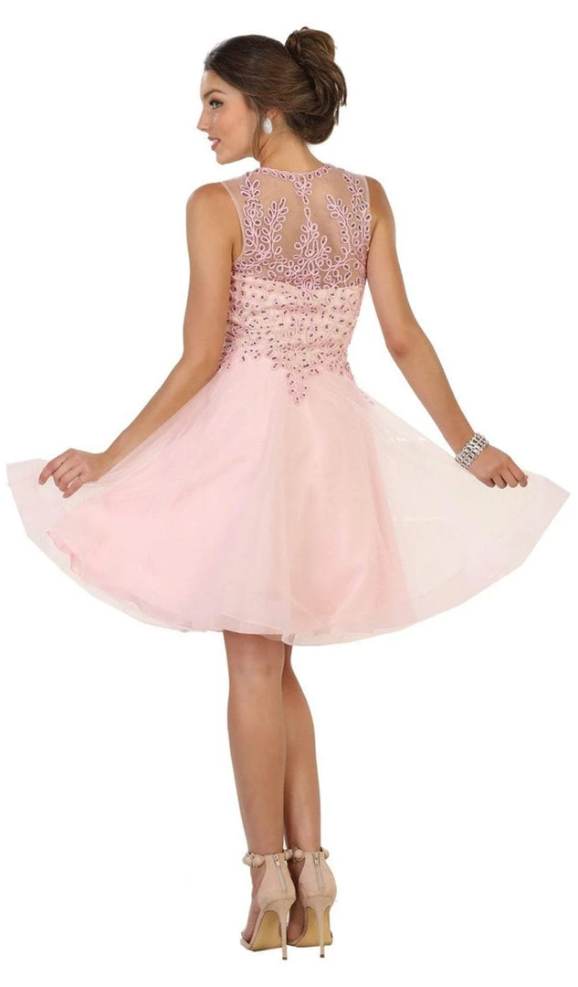 Luxe and elegant, this beautiful textured dress by May Queen MQ1532 is a breath of fresh air. This lovely dress features a sleeveless, V-neckline supported with wide straps and a sheer inset at mid-bust. The bodice is lavishly adorned with jewel accents. The skirt falls at knee length and flares an A-line silhouette. Eye-popping style radiates from every last inch of this chic, sultry little May Queen dress.