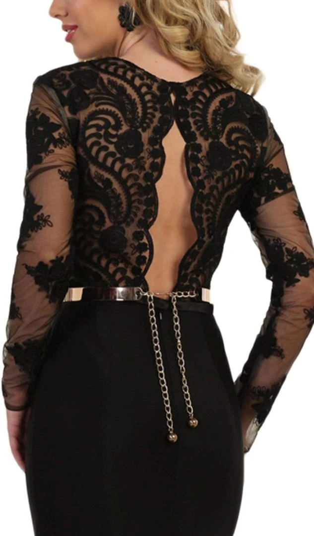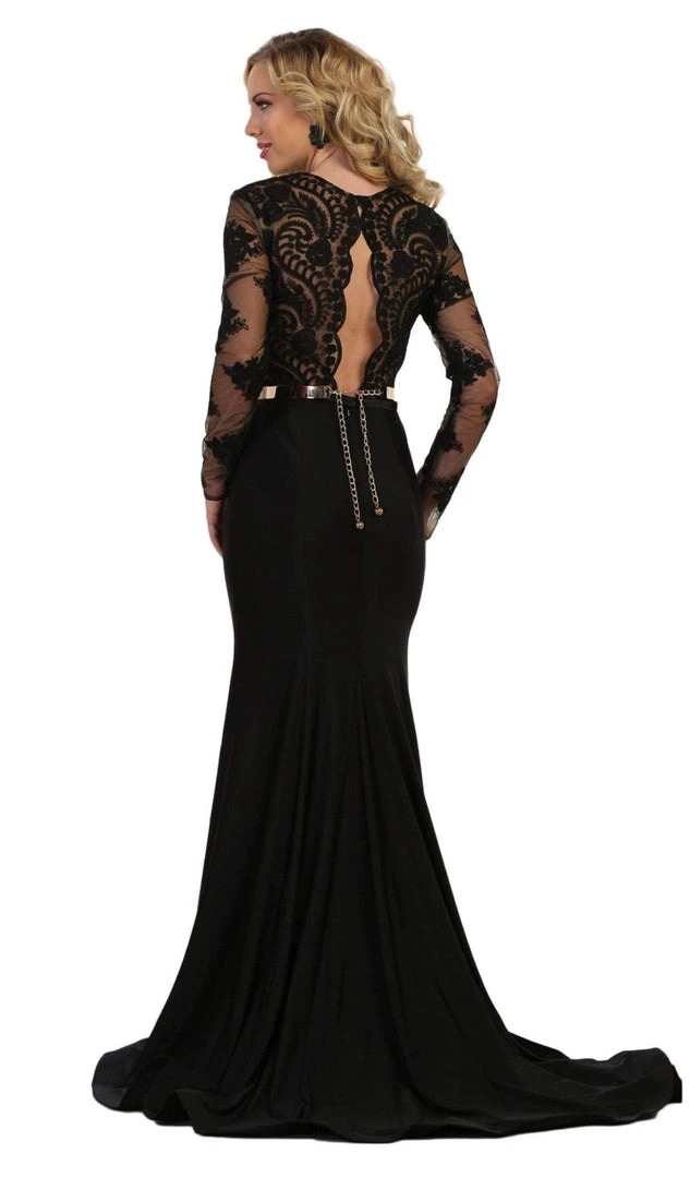 Fashions a sheer long sleeve, deep scalloped V-neckline with sheer inset at mid-bust. The waist is wrapped in a shiny belt and the back flaunts an open back detail. The skirt tapers at the thighs and flares at the bottom in a sweep train finish.