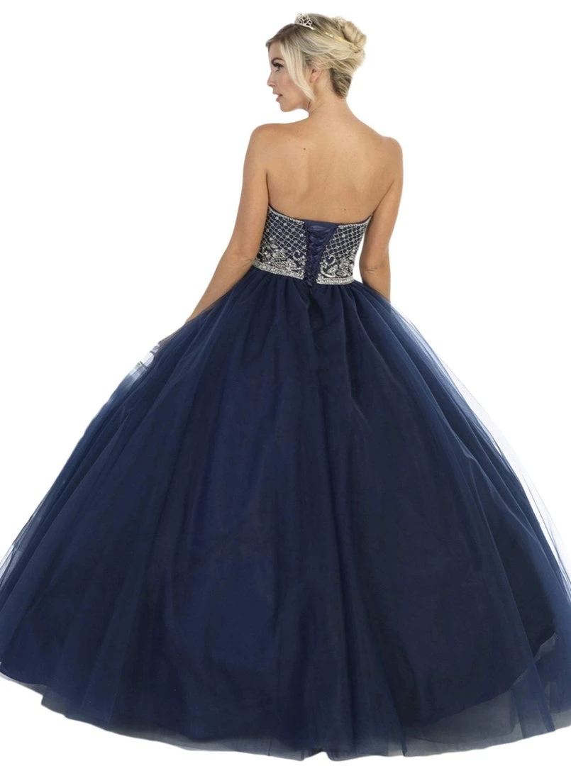 Make your night one to remember in this stunning gown by May Queen LK114. This strapless gown flashes a straight across neckline with fitted bodice richly decorated with glittering embellishments. The back has a lace up closure for an adjustable fit. The skirt opens in a ballgown silhouette. Feminine, bold, and imperial, this gown from May Queen will definitely make you shine!