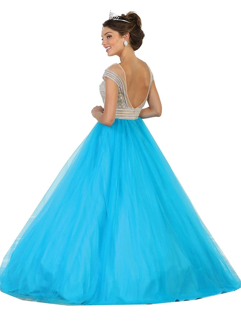 Bring out your youthful charm in this dazzling evening gown by May Queen LK87. This gown showcases cap sleeves and illusion bateau neckline with a low V-shape back. The fitted bodice is designed with sparkling crystals for a luxurious effect. A floor-length, ball skirt unfolds from the fitted waistline and drops to the floor in a dramatic flare. Be in this exquisite creation by May Queen and leave a lasting impression.