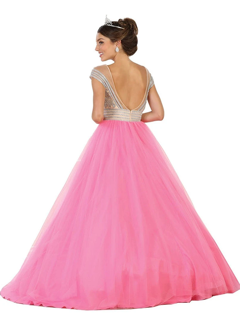 | Details: | Quincenera dress, Illusion neckline, Embellished bodice, V-shaped back, Layered tulle skirt |
