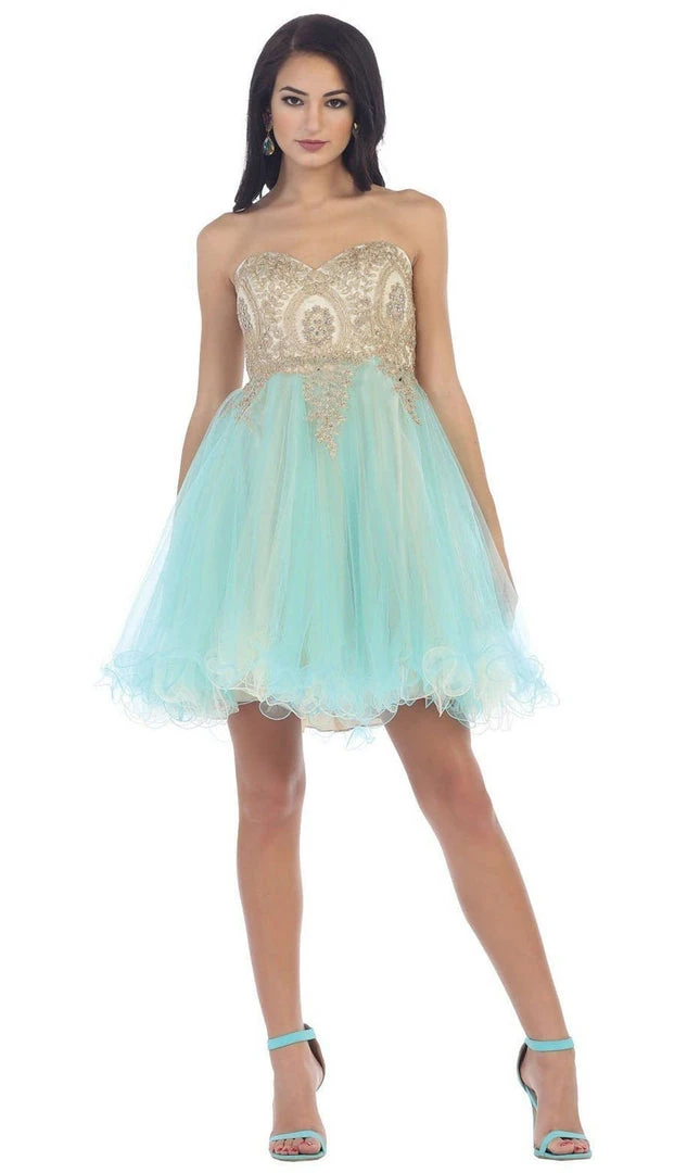 Dance the night away with this attractive May Queen MQ-1286 cocktail dress. A sweetheart neckline crowns the strapless bodice beautified with vine-like appliques. Layers of tulle at the a-line skirt cascades to a mid-thigh length finished off with a curled hemline. The mid-open back is enclosed with a lace-up detail making it easy to adjust. This sweet May Queen style is sure to make you the darling of the crowd.