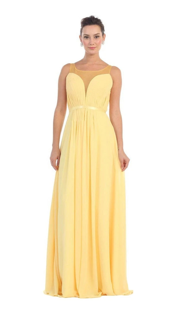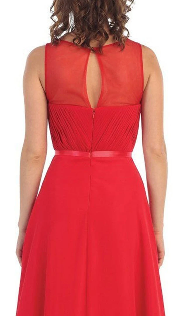 Walk with grace and elegance as you enter any party when clothed in this simple yet statuesque creation. Topped with a finely-tucked bodice, this piece displays a bateau over a sweetheart neckline and an open back with a keyhole cutout. Cinched by a satin waistband, the A Line skirt softly pleats as it flows down to full-length hem. Be remarkably beautiful at every event in this delicate masterpiece. Model is wearing Red, Blush, Yellow and Lilac color.