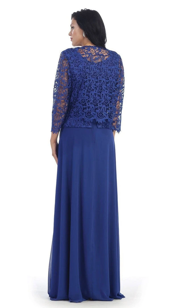 Be the embodiment of elegance in this exquisite lace creation. This two-piece ensemble flaunts a bateau neckline and a modest open back. Topping the elegant dress is a sheer lace jacket with three quarter sleeves and scalloped cuffs. The fitted bodice features a lace fabric with a shirred waistband. The soft fabric that forms the A-line skirt gently pleats down to a modest full-length hem. Anticipate compliments from your peers in this elegant laced jewel.