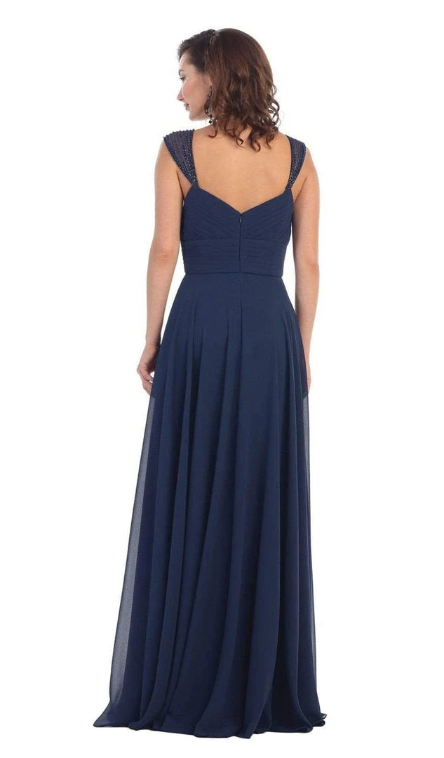 Featuring sheer embellished straps framing the sweetheart neckline, this lovely piece showcases a pleated bodice, a v-shaped open back and a chiffon A-line skirt. Model is wearing Navy color.