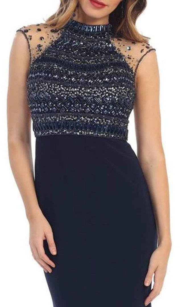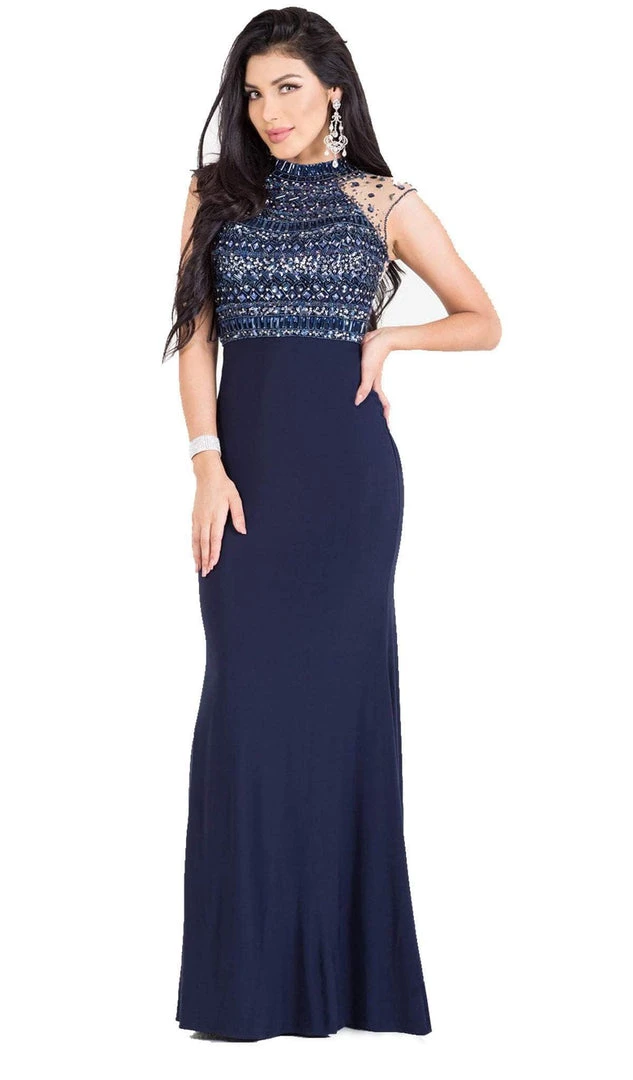 Stand out in every occasion with this daring creation. A floor-length, fitted dress with high neck, embellished empire-waist top. This dress is perfect for any formal evening. Model is wearing Navy color.