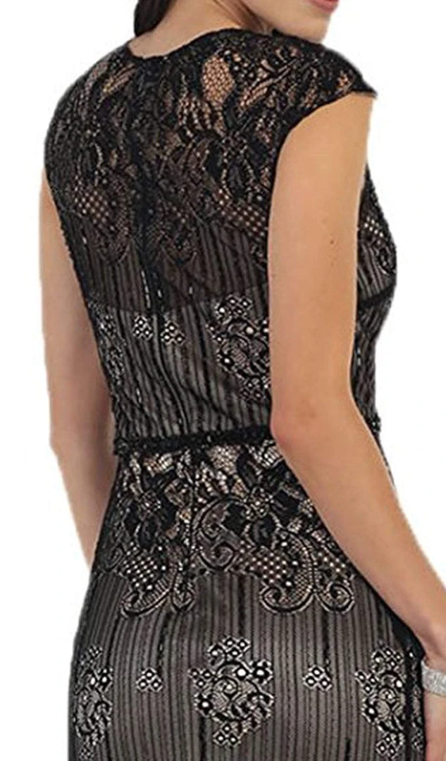 Enter the hall with grace and beauty in this evening gown by May Queen RQ7448. This lace gown features cap sleeves and a scoop neckline. The fitted bodice boasts lace overlay with speckled sequins throughout. The skirt has a soft mermaid silhouette and finishes with a full-length hem. Show off your irresistible charm and faultless poise in this spectacular May Queen masterpiece. Model is wearing Black/Nude and Dusty Rose/Nude colors.