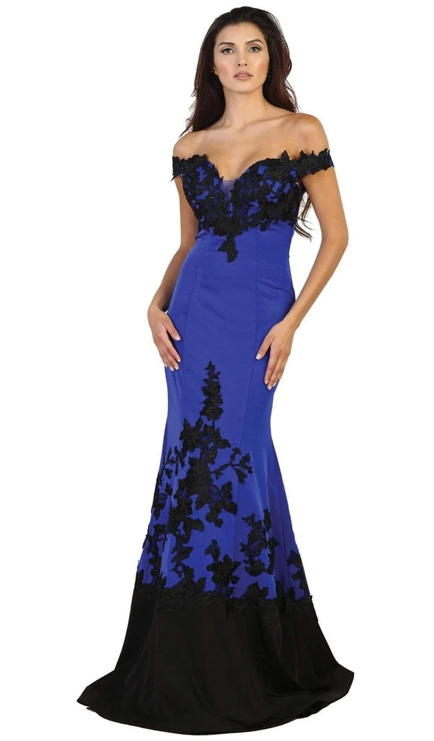 Dress to impress with this May Queen RQ7499 creation.?ÿThis full-length vibrant satin gown is framed with an off-shoulder neckline with mesh panel in-between the sweetheart bustier, and has seam sculpted fitted bodice. Contrasting black floral appliques embellished the top bodice and ornate the pleated skirt, while a solid black satin fabric ends the dress with mermaid flair and sweep train finish. This May Queen creation definitely parades the elegant and classy style.