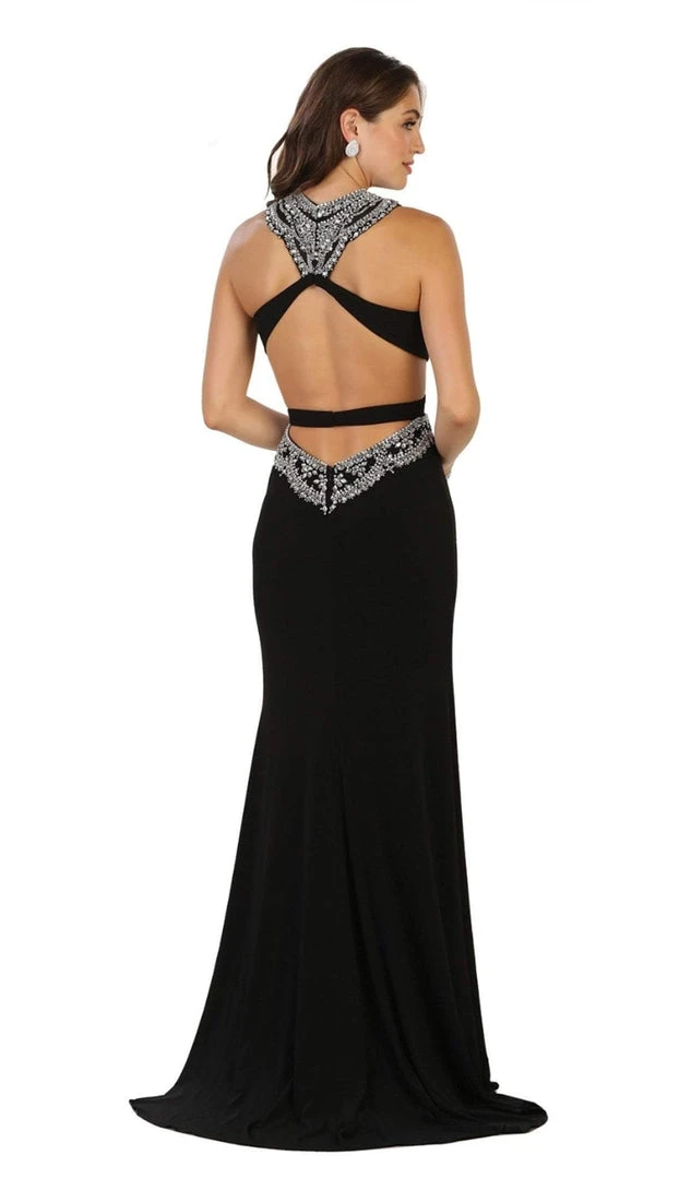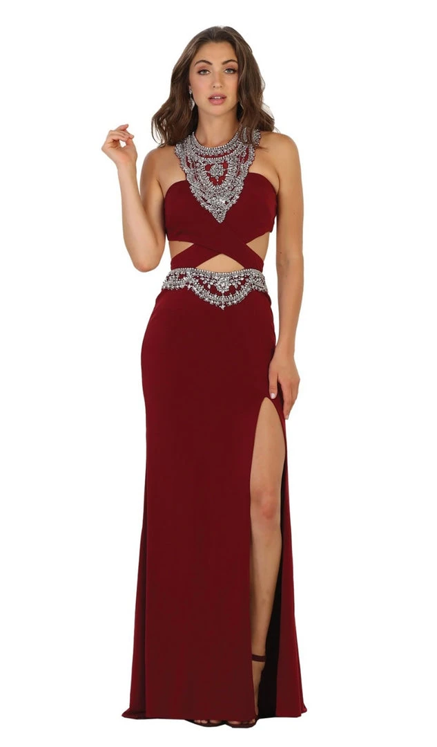 Be dressed up glamorously in this striking evening dress by May Queen RQ7526. Stunning bead embellishments adorn the neckline and waist for a sparkling effect. The fitted bodice offers a halter neckline, crisscross midriff which forms the cutout details and embellished waist that tops the sheath skirt. This gown is full length with side slit that highlights your sexy legs, a back with sexy cuts that will sure to turn heads and sweep train for added drama. Ensure you have all eyes on you all night long when wearing this chic and class May Queen creation.