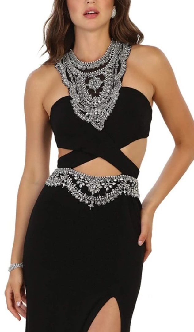 | Details: | Embellished Neckline and Waist, Crisscross Waist, Side and Back Cutouts, Fitted, Floor Length, Side Slit, Back Zipper Closure, Sweep Train |