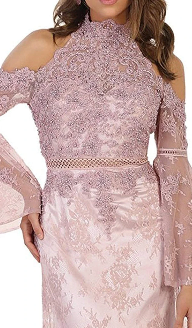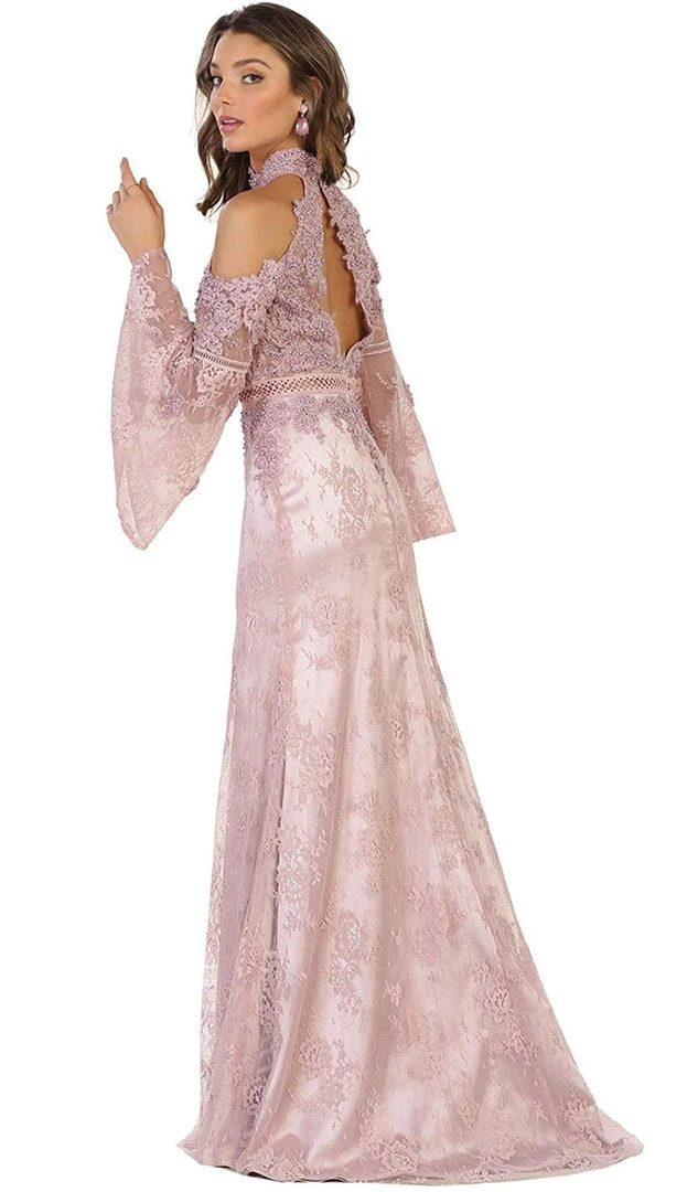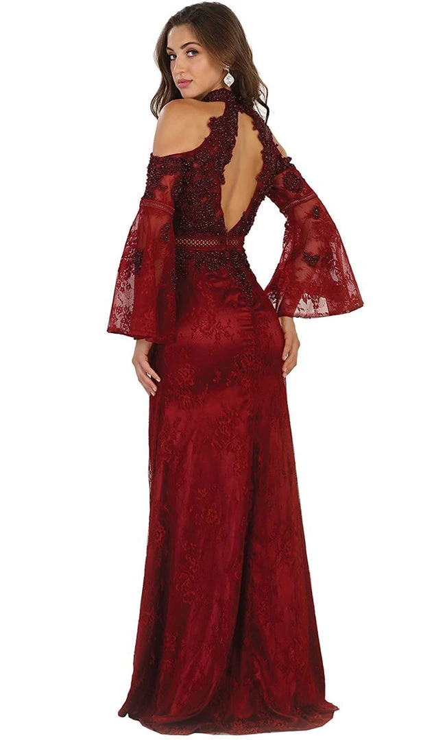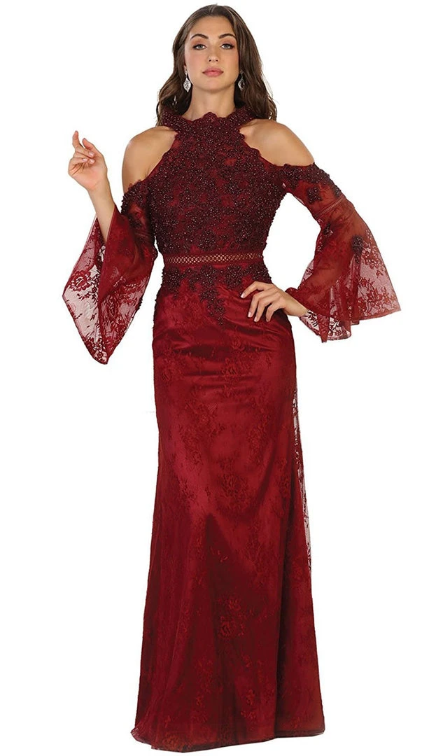 Be ready to fascinate everyone with this evening gown by May Queen RQ7541. The halter neckline bodice has long exotic circular flounce sleeves and creates a glamorous cold shoulder look with cutout details in all the right places. Body-conscious and made to show off your curves, the natural fit sheath skirt dances down your legs with a full-length hem. Look your absolute best and make a night to recall in this May Queen design. Model is wearing Burgundy and Mauve colors.