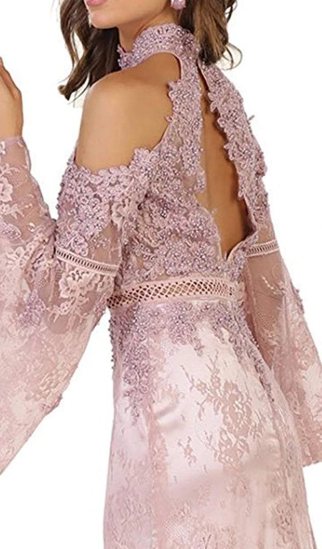 | Details: | Sheer long flounce sleeves, Cold shoulder cut, Lace applique, Beaded, Keyhole back, Sweep train |