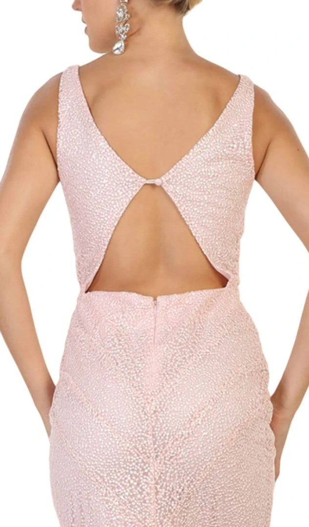 Dominate the attention of many when you glide in this exceptional May Queen RQ7607 creation. Crafted in a beautifully beaded mesh fabric designed in a sleeveless bodice, this chic piece flatters with a plunging v-neckline with an illusion modesty inset. Fashioned with a v-open back accented with a triangular cutout design, the mermaid skirt glimmers as it slides down the hips and flares amazingly down into a sweeping train. Unveil that opulent stunner in you in this chic May Queen masterpiece.