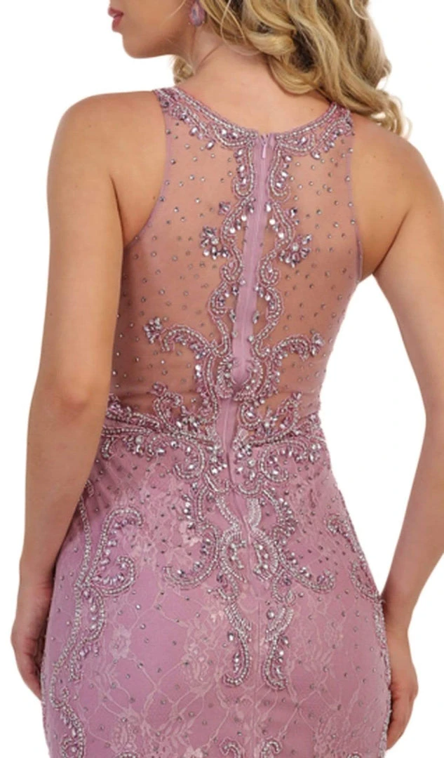 Light up the room with your vibrant presence in this captivating May Queen RQ7623 creation. Beautifully adorned with a mix of crystals and tonal beadwork crafted in an elaborate motif, this enticing piece flourishes a jewel illusion over a sweetheart neckline. Detailed with sheer full back, this lace ensemble showcases an ornate trumpet silhouette and completes with a gossamer flare. Live every moment of this glorious night in this chic May Queen masterpiece.