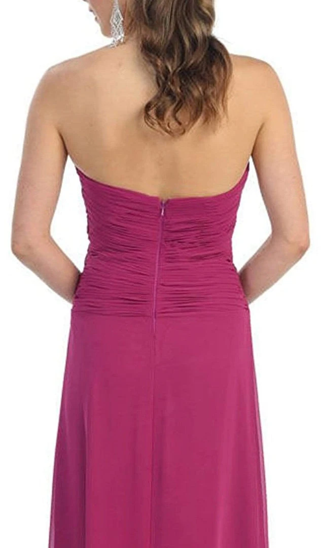 Step out in style wearing this May Queen MQ 838 evening gown. This gorgeous creation features a strapless bodice with sweetheart neckline. Crystal embellishments in floral form beautify the ruched bodice. The full length skirt crafted in chiffon fabric highlights a ruffled detail in asymmetric form. The back is mid-open enclosed with a center zipper closure. A sheer quarter length sleeves jacket adds formality to the whole creation. Set the trends in a stylish gown from May Queen design.