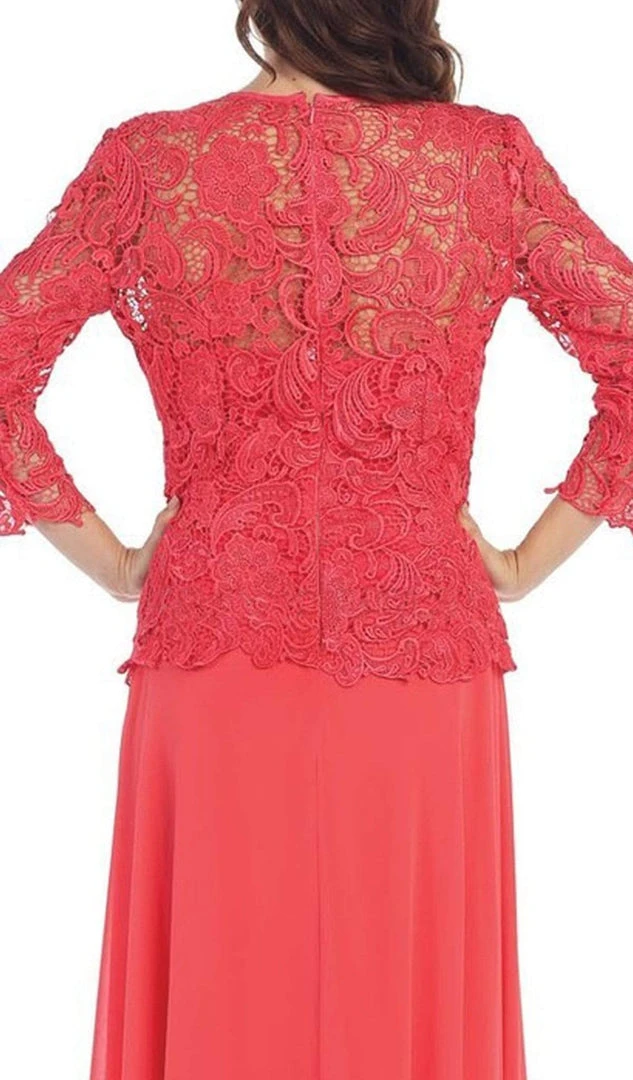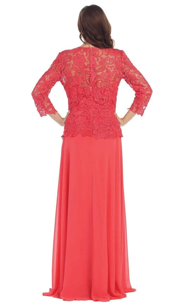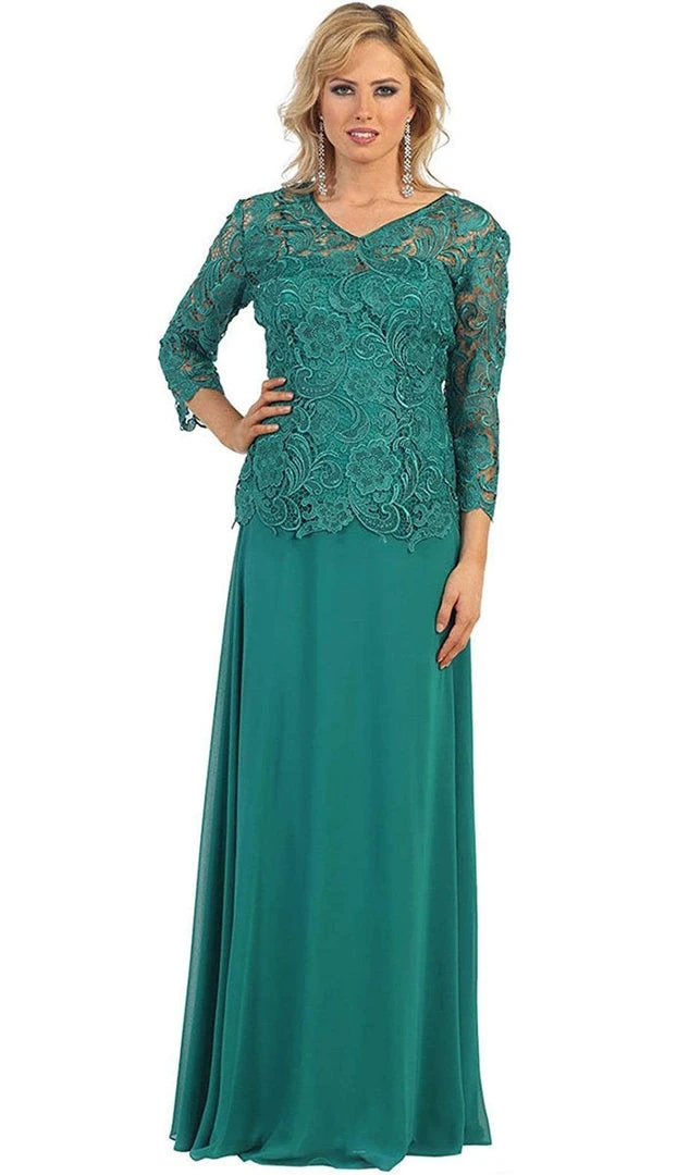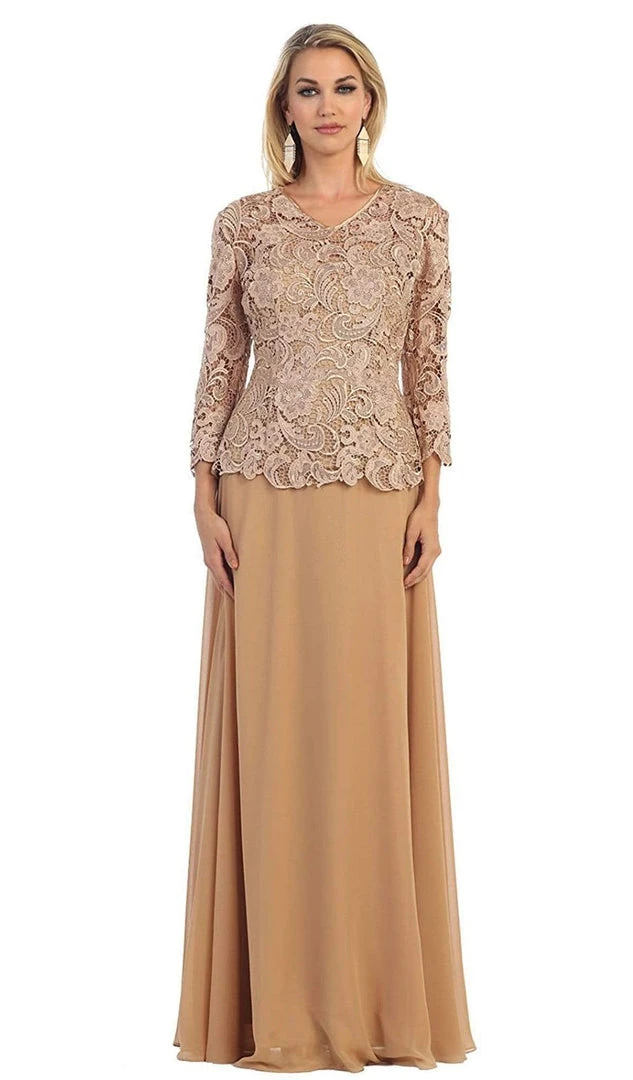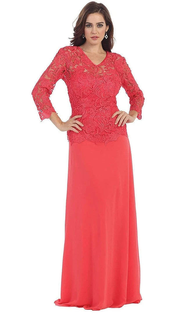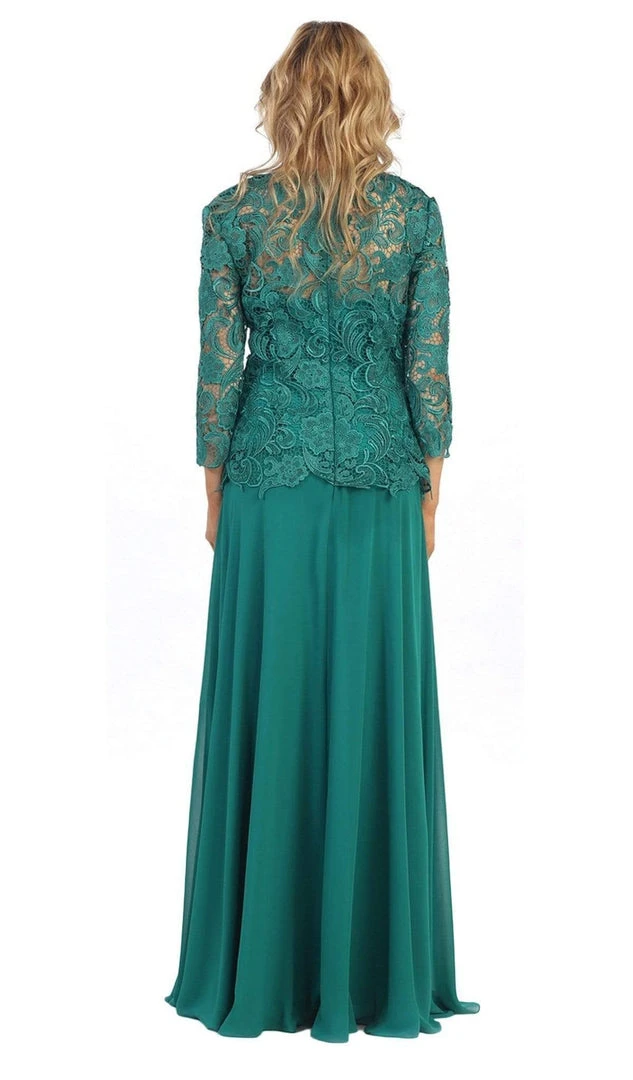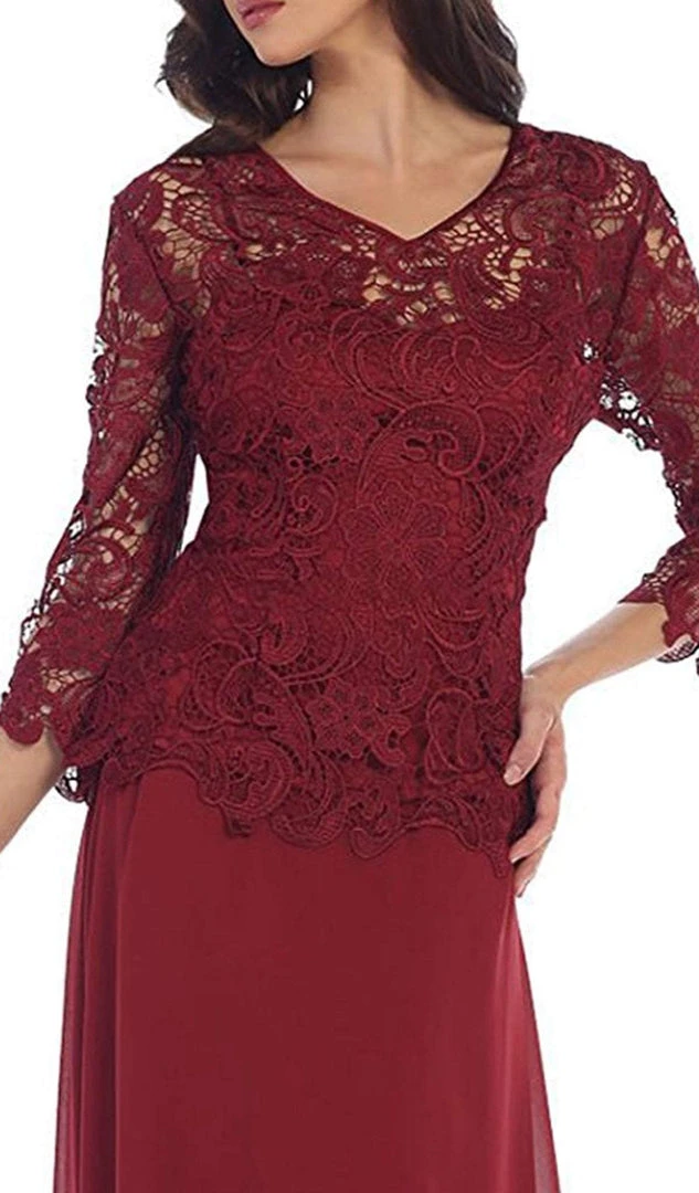 Be a lady of class and sophistication in this truly refined formal long dress. Featuring a small v-neckline in lovely accents of glorious floral patterned lace. Long sleeves with scalloped edging create a classic look while the soft chiffon flows down to the floor. This dress is available in multiple colors, perfect for formal gathering or wedding, especially fitting for the mother of the bride.