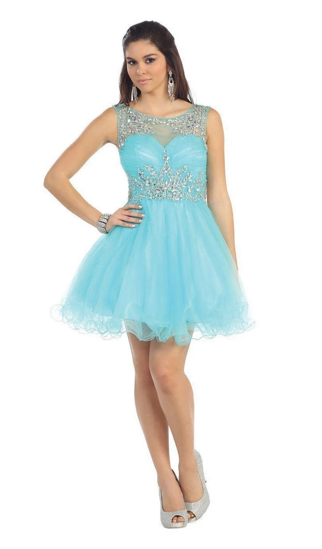 | Details: | Beaded, Sleeveless, Illusion neckline, Tea length skirt, Low back |