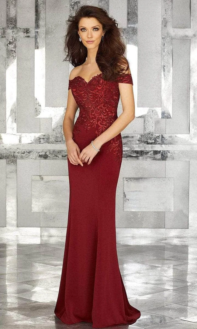 This long crepe dress features an off-shoulder neckline with fitted bodice designed with bead embroidery. The skirt forms a fit and flare silhouette and finishes in a sweep train. Models are wearing Navy and Wine colors. Find more mother of the bride dresses!