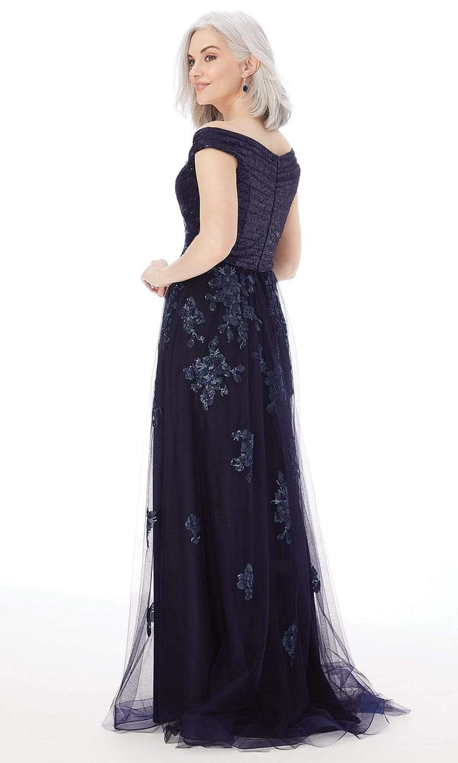 Glow with an unforgettable sophistication in this fabulous MGNY By Mori Lee 72228 evening gown. This long formal dress ensemble takes pride with its classy off shoulder neckline over finely pleated surplice sequined bodice. Embroidered appliques add to the alluring details of the gown as the A-line skirt show lush gathers that parts in a draping high slit before completing with a sweep of train. Enjoy the attention of the fascinated crowd in this MGNY By Mori Lee masterpiece. Model is wearing Navy color.