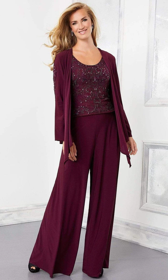 Sophisticated and statuesque, this sumptuous Pant suit style by MGNY By Mori Lee 72304 for formal evening matches your elegant persona. A three-piece ensemble showcasing a crystal beaded sleeveless top with scoop neckline and a V back with a center keyhole, hidden zipper and hook and eye closure. The jersey jacket has three-quarter length bell sleeves and featured with beaded embroidered detail surrounding the cut-out keyhole along the arms. The loose fitting jersey pants is styled with wide legs and finishes with full-length hem. Brandish a style that speaks of impeccable elegance in this MGNY By Mori Lee creation.
