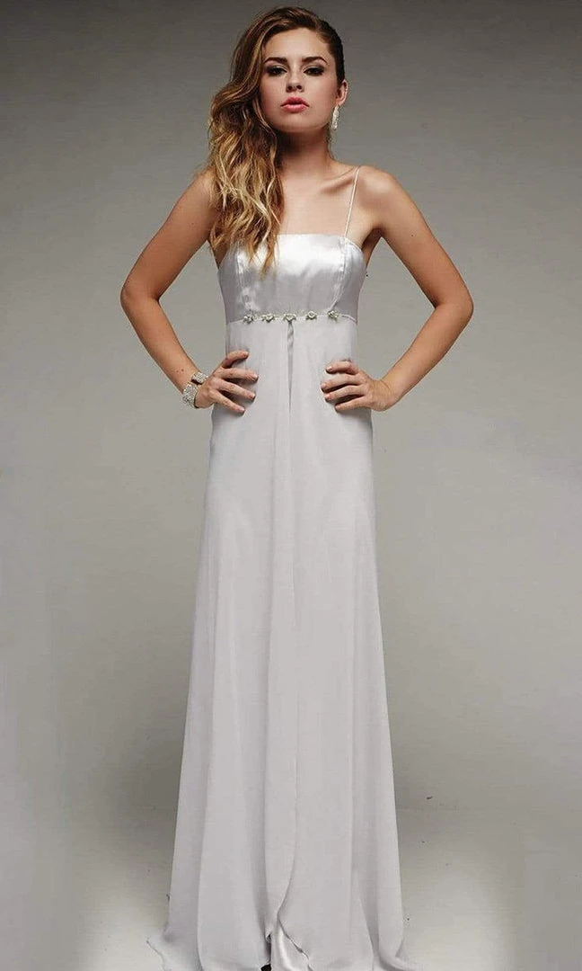 This long satin evening gown is done in lovely straight neckline and fine spaghetti strap with draped Chiffon fabric trimmed perfectly from the under bust highlighting the empire waist of this alluring floor length dress. This Milano formal creation is simply breathtaking!