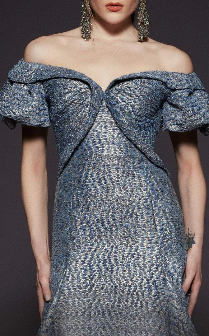 Enter the hall with grace and beauty in this unique piece by MNM Couture 2443. Flaunts an off the shoulder neckline with short puff sleeves. The fitted bodice has an interesting lining that drapes at the sides. From the empire waist begins a full length trumpet skirt that finishes in a sweep train. Feel dainty and feminine in this enchanting design by MNM Couture. Model is wearing Blue color.