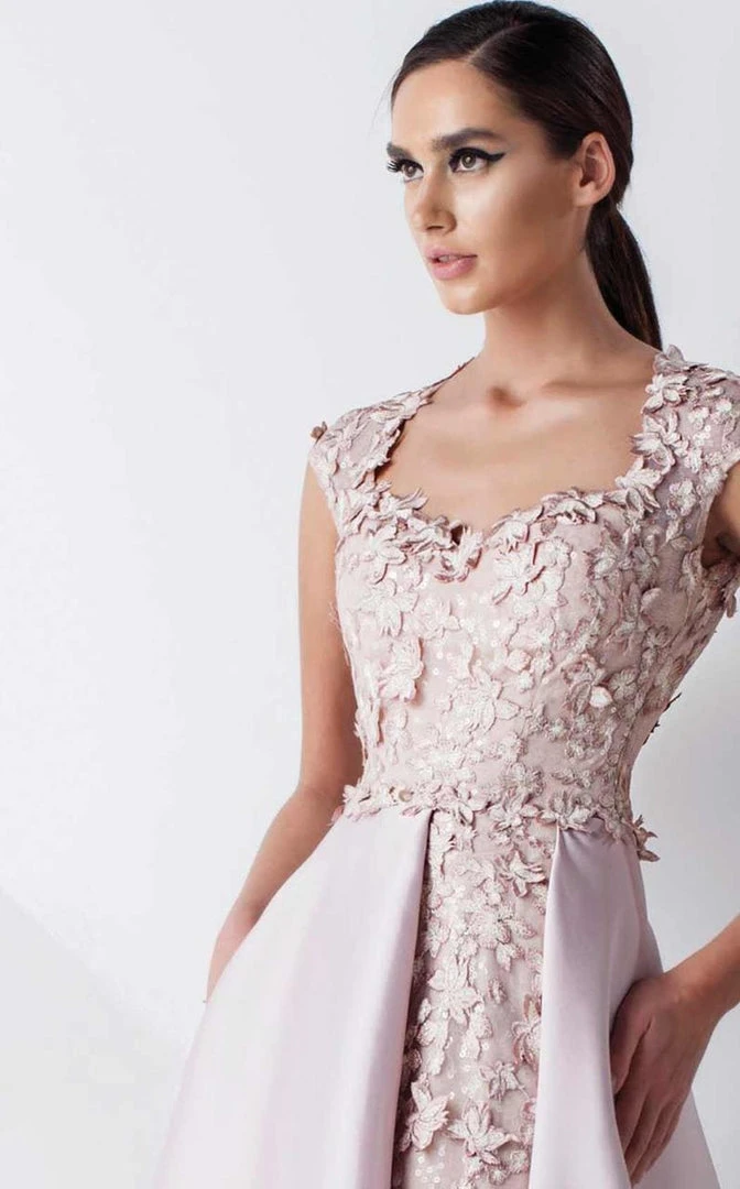 Expect to be turning heads as you walk into your special event wearing this creatively romantic evening gown by MNM Couture G0768. Cap sleeves and floral motifs create a dreamy look throughout the fitted bodice of this full length gown. A fabulous addition arrives in the form of a smooth extension along the waistline that runs the dimension of the gown. MNM Couture will let you celebrate that divine feminine beauty!