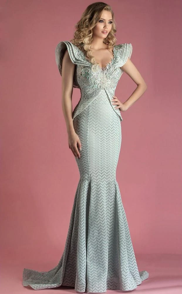 Be the spotlight wearing this extravagant look from MNM Couture K3545. This full length dress flaunts a plunging V-neckline with unique design of sleeves. The embellished bodice has a form fitting silhouette and leads to a mermaid skirt with sweep train. This MNM Couture dress is ideal for red-carpet occasions. Model is wearing Aqua color.