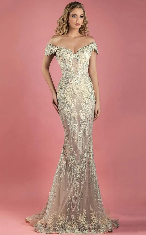 Mesmerize the crowd as you walk in this sparkling dress by MNM Couture K3555. This long dress boasts a charming off the shoulder neckline with sheer boned bodice dazzled with glittering pearls and floral appliques that cascade to the full length trumpet skirt with sweep train. Be in this gorgeous MNM Couture creation and leave a lasting impression. Model is wearing Beige color.
