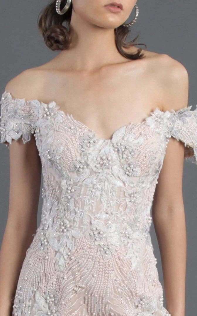 | Details: | Off-shoulder sleeves, Pearls, Floral appliques, Sheer, Boning details, Trumpet skirt, Sweep train |