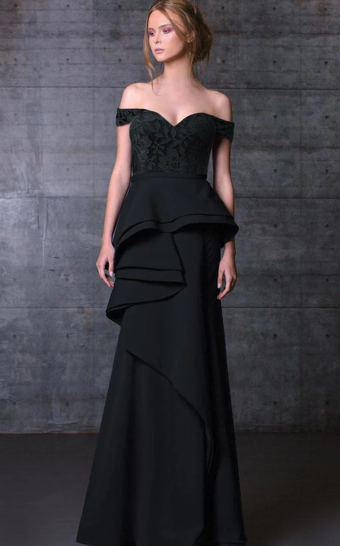 Create a perfect evening wearing this elegant evening dress by MNM Couture N0104. This dress is off-the-shoulder with baroque floral lace throughout the bodice. Below the waist asymmetric peplum, the distinct skirt is smooth with an A-line silhouette and full length hem. It is a classic silhouette with fashionable elements. This creation from MNM Couture will sure to display your natural beauty and grace.