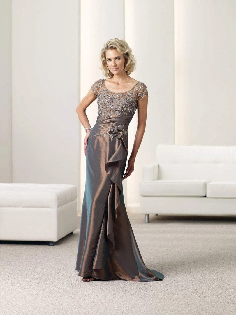 Taffeta slim A-line dress with short sleeves, bodice features scoop neckline and sleeves with elaborate hand-beaded illusion overlay, beaded illusion back bodice with keyhole, ruched midriff with asymmetrically dropped waistline, side cascading ruffle.