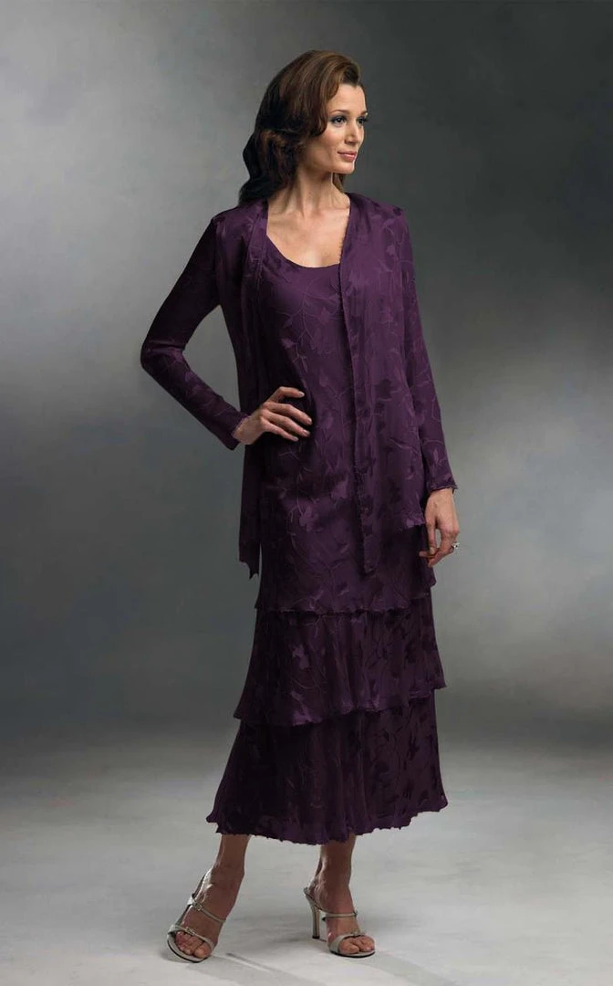 Two-piece silk chiffon burnout dress set, sleeveless soft A-line dress with scoop neckline, dropped waist, three-tiered ballerina length skirt, matching long sleeve cardigan-style jacket.