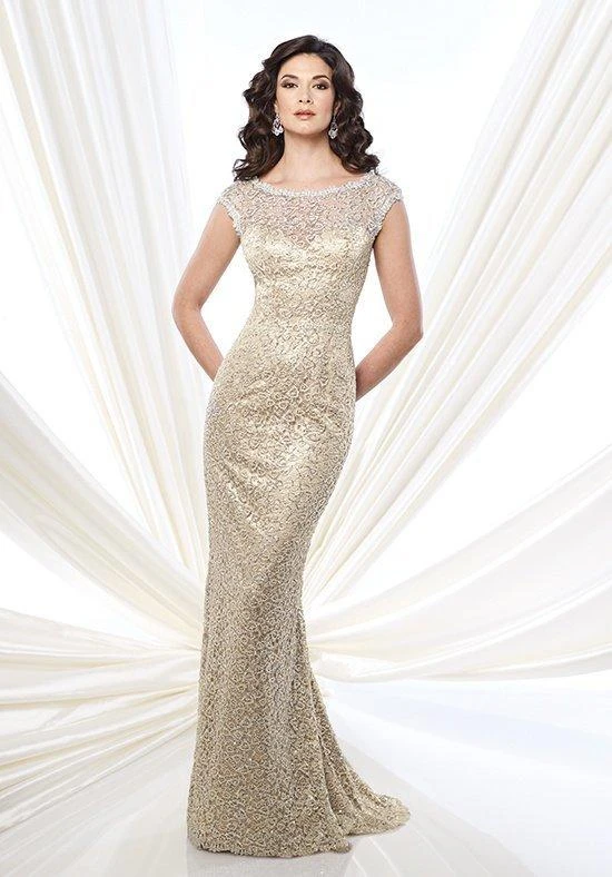 Sequin lace sheath with lace illusion cap sleeves and bateau neckline, sweetheart bodice, lace illusion back, sweep train. Mode is wearing gold color.