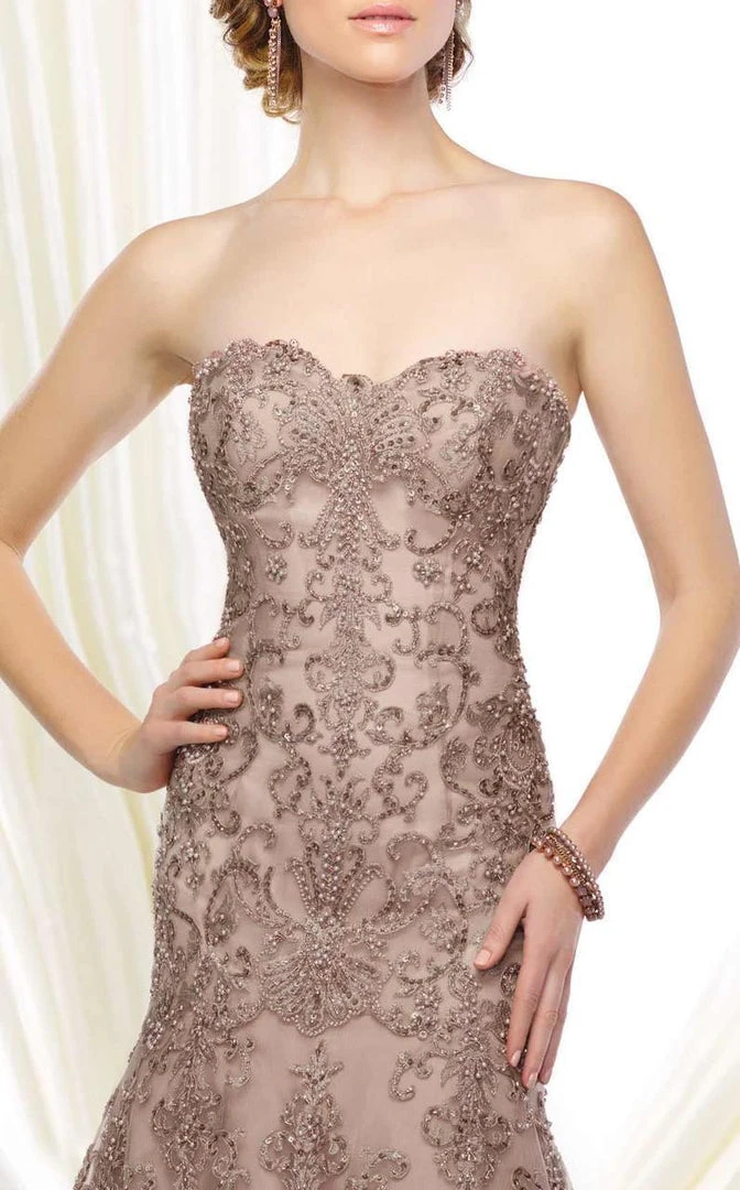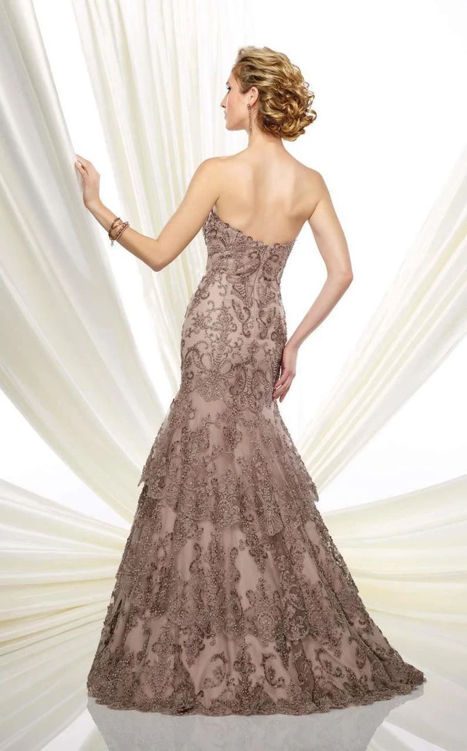 Strapless hand-beaded metallic lace and tulle fit and flare dress with sweetheart neckline, dropped waist, scalloped multi-tiered skirt with sweep train. Matching shawl and removable straps included.