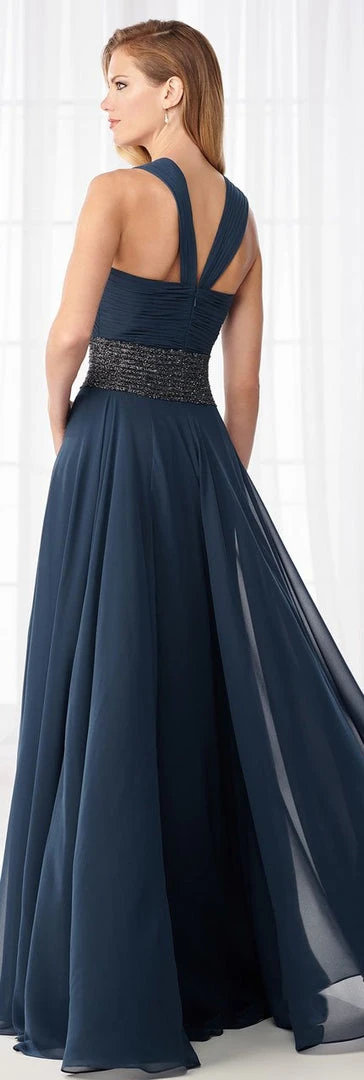Enter the hall with grace and beauty in this lovely Cameron Blake 218615 evening dress. An inverted halter straps support the ruched bodice adorned with wide beaded motif at the natural waist. Wonderful pleats cascade through the gathered skirt of this absolutely breathtaking gown. A center zipper closure secures the back for a perfect and flattering fit. This a-line dress comes with a matching shawl. Look your absolute best and create a night that you’ll never forget with this Cameron Blake masterpiece.