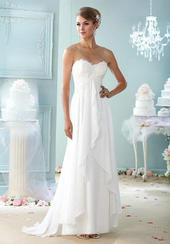 Strapless lace and chiffon A-line gown, sweetheart neckline, empire lace bodice, top skirt layer flows from center front bodice and ruffles down to open bottom, sweep train. Model is wearing White color.
