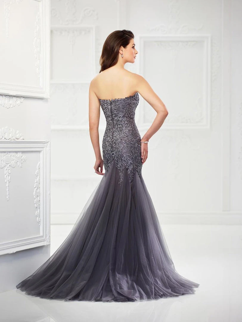 Enhance your visual appeal in this luxurious dress by Montage by Mon Cheri 118964W. This gorgeous strapless tulle trumpet gown with unique lace appliques and heat set stones offers a sweetheart neckline, a beaded lace applique bodice with a dropped waist, a tulle inset flared skirt with a chapel train. A matching shawl and removable straps are included. You are statuesque in a posed gown from Montage by Mon Cheri.